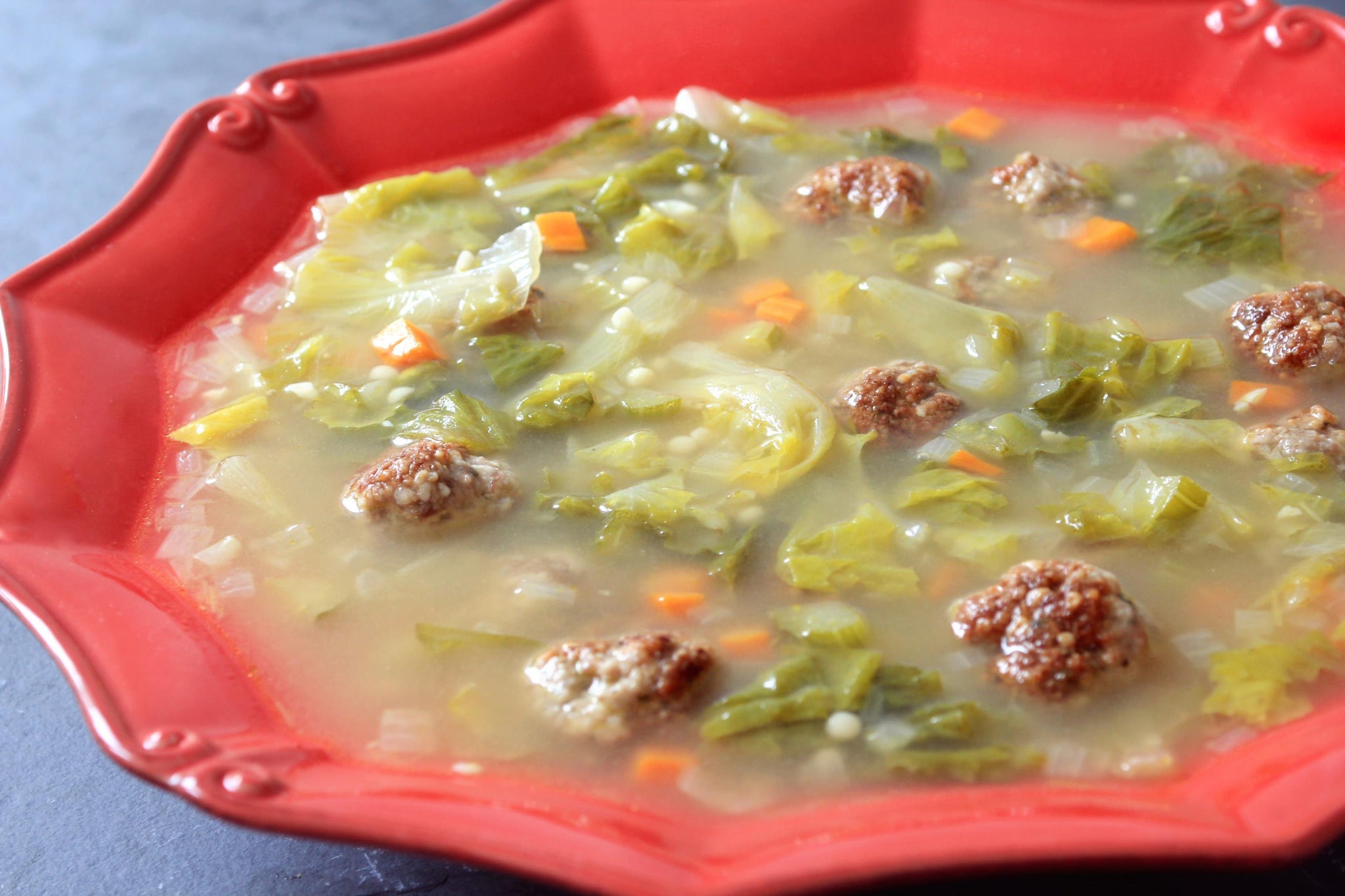 - Soup: Heat 1 tablespoon oil in a 5-quart Dutch oven over medium. Add the onion, garlic, carrot and celery; cook, stirring occasionally, until softened, about 7-8 minutes. Pour in the broth and increase the heat to medium-high. Bring to a boil, reduce the heat to medium-low, add the escarole and pasta; simmer until greens are fairly tender, 10 minutes. Add the reserved meatballs, cover, return to a simmer and cook 5 minutes longer. Season with salt and pepper.