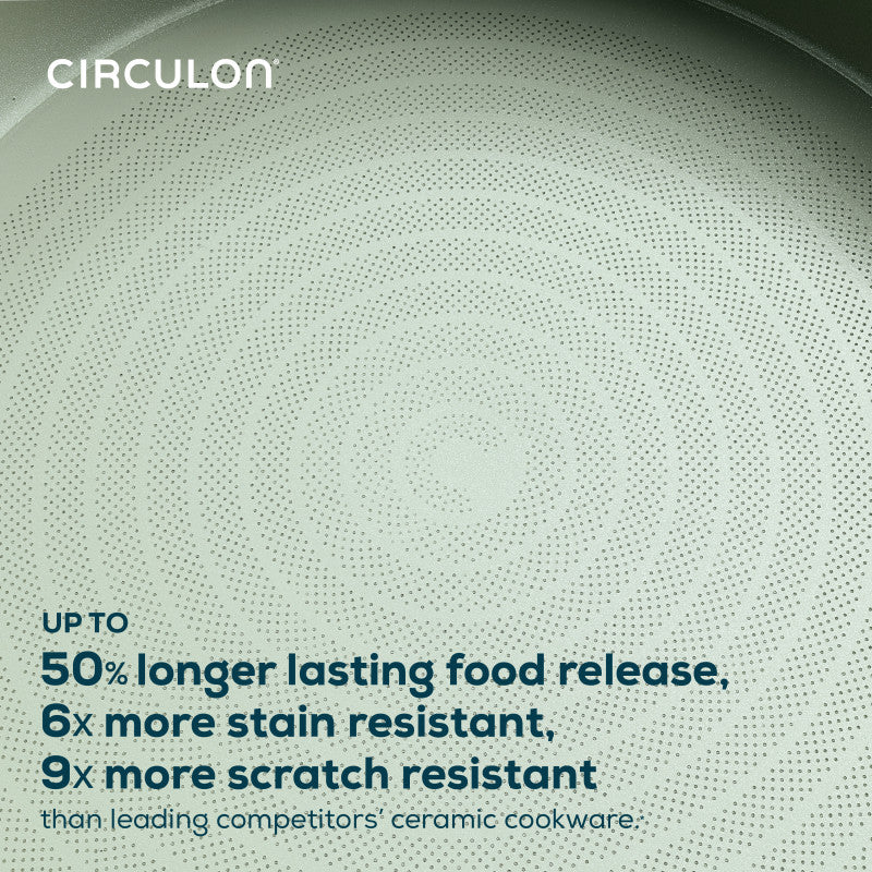 Circulon Halo with LaserDefense Ceramic Nonstick is a new gold standard in ceramic nonstick - engineered for endurance with laser-etching technology against chips, stains, and scratches for undeniable durability, day after day. It's 6x more stain resistant, 9x more scratch resistant, and has 50% longer-lasting nonstick release than the ceramic nonstick competition**. And with a statement-making, creamy monochromatic finish, Circulon Halo is proof that high-performance nonstick cookware doesn’t have to blend in.