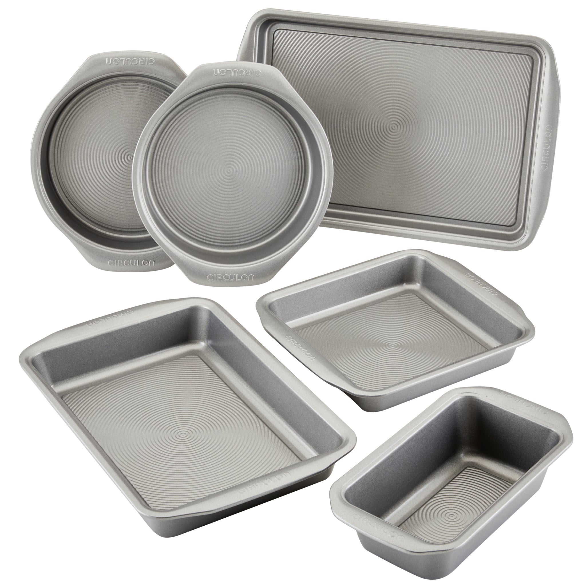 (2) 9-Inch Round Cake Pans, (1) 9-Inch x 5-Inch Loaf Pan, (1) 9-Inch Square brownie pan, (1) 9-Inch x 13-Inch Rectangular Cake Pan, (1) 10-Inch x 15-Inch Cookie and Sheet Pan