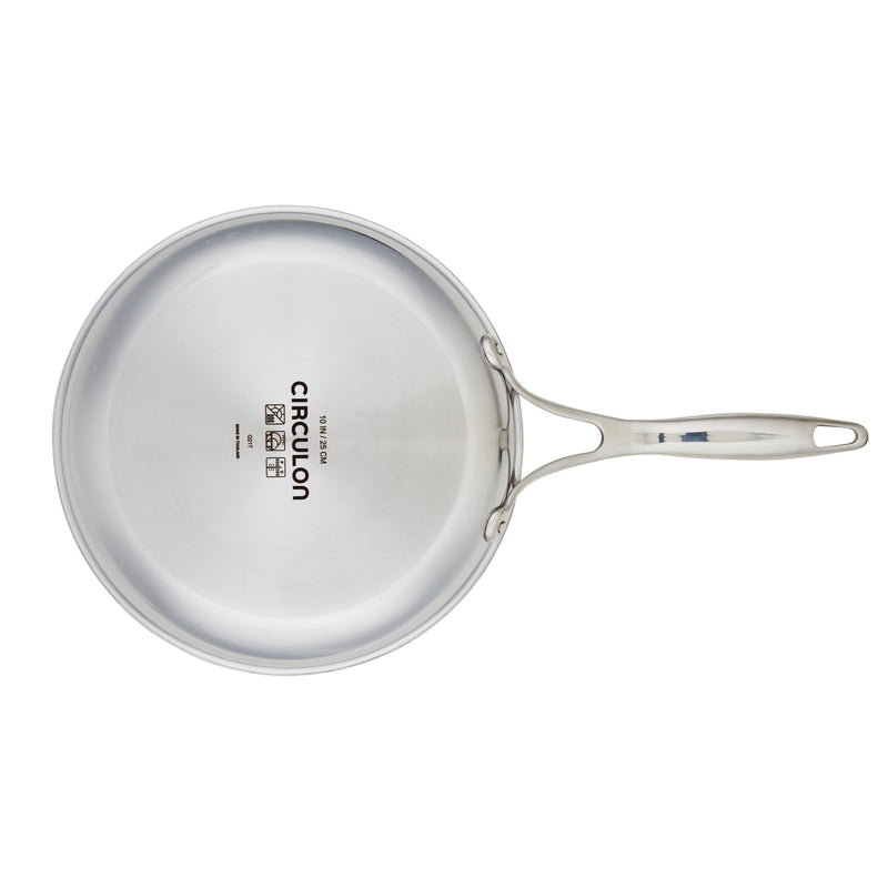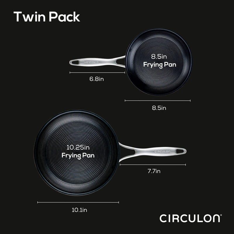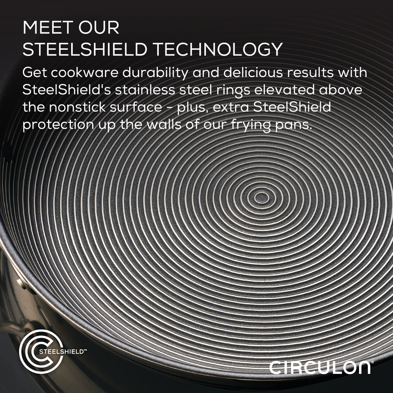 Welcome to cooking without worry. These perfectly constructed 10-inch and 8.5-inch frying pans combine the beauty and durability of stainless steel with the cleaning convenience of nonstick. Circulon's SteelShield™ technology features elevated steel rings to protect the nonstick surfaces (and extends up the walls of the frying pans), so you never have to worry about scratched nonstick again. Our unique, easy-to-clean flush rivet system provides an amazingly smooth cooking surface, and tri-ply clad construction means your frying pans heat up quickly to reduce hot spots on any cooktop, including induction. Dishwasher safe for easy cleanup, completely metal utensil safe, and oven safe up to 500°F for cooking a wide range of recipes.