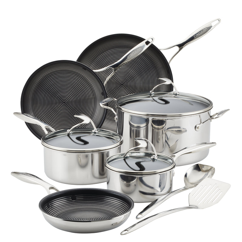 Welcome to cooking without worry. Perfectly constructed cookware set combines the beauty and durability of stainless steel with the ease and convenience of nonstick. SteelShield(tm) technology features steel peaks to protect the nonstick grooves, so you never have to worry about scratched nonstick again. Extra thick base heats up quickly to reduce hot spots on any cooktop, including induction. Plus, SteelShield nonstick is completely metal utensil safe. To prove it, we even included a stainless steel turner in the set! Cooks like steel, cleans like nonstick. Circulon SteelShield gives you the best of both worlds.