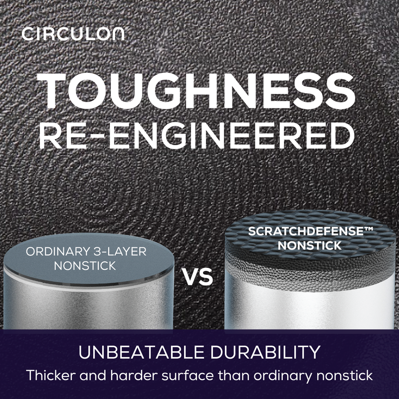 From the inventors of hard-anodized nonstick cookware comes Circulon ScratchDefense™. Open up a new dimension in scratch resistance and unbeatable nonstick performance and longevity with ground-breaking ScratchDefense™ nonstick technology that applies aerospace-grade durability to eliminate scratching, sticking, and flaking for our most advanced nonstick yet. Cook with complete confidence using this dishwasher-safe 5-quart saute pan with a triple-layer nonstick cooking surface that lasts 130X longer than the competition and stands up to laboratory tests simulating 200+ years of daily wear and tear. An aluminum core delivers fast, all-over heat delivery and a thick, induction-suitable stainless steel base boosts durability and heat retention. Circulon ScratchDefense™ - EXTREME NONSTICK THAT WON’T SCRATCH. EVER.