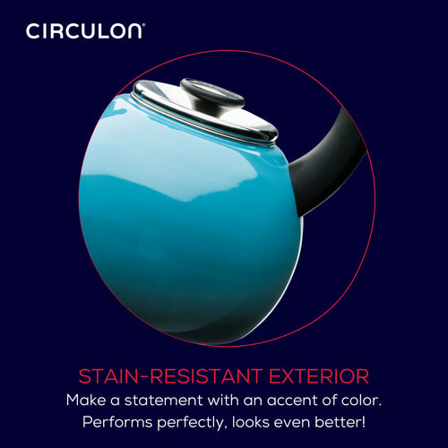 Welcome to cooking without worry. Brew piping hot, delicious teas, coffees, hot chocolate and more with this stylish stovetop teakettle from Circulon. Long-lasting enamel on steel construction with a gorgeous, stain-resistant finish is engineered to heat water quickly on any stovetop, including induction. A sturdy kettle handle is cleverly designed for comfortable use, and the flip-up spout pours safely and easily when brewing.